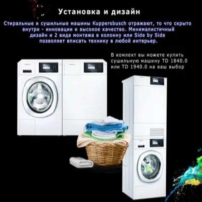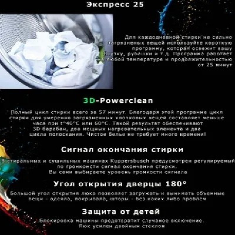 Стиральная машина Kuppersbusch W 20.0 W белаяПрограммы/дополнительные программы:Программы стирки от 20 до 90°C (2 нагревательных элемента) Программы экспресс-стирки на любой температуре длительностью от 20 минут Стандартные программыХлопок, Хлопок 3D-Powerclean, Легкий уход, Ручная стирка, Шерсть, Шелк, Тонкое белье, Смешанная стирка, Быстрая стирка 15 минут, Сорочки/Блузки, Разглаживание, Спортивная одежда, Джинсы, Шторы, Пропитка, Детское белье, Автоочистка (Программа очистки машины)Программы ECO Хлопок, Легкий уходДополнительные функцииЭкспресс, Предварительная стирка (пятна), Уменьшение температуры, Скорость отжима, Остановка полоскания, Замачивание3D стирка - это возможно !Особенности оснащения: Большой цветной дисплей 4.3“Ребра барабана для 3D-Стирки (технологии 3D-Washing)Шумоизоляция: Silent PlusСветодиодная подсветка барабанаДатчик регулирования загрузкиИндикация хода программы и времени до окончания программыОтложенный запуск – до 7 днейИндивидуальные настройки: например, дополнительный цикл полосканияРегулируемый по интенсивности акустический сигнал окончания программыБак из нержавеющей сталиУгол открывания люка – 180°, диаметр люка – 34 смВозможность перенавески люка (правая/левая)Хромированный люкЗащита от детей, двойное стекло люкаСистема защиты от протечки Aquastop / Контроль пенообразованияКомпенсация дисбалансаИндикация подачи / слива водыОбзор специальных программУличная и спортивная одеждаЭта группа программ подходят для стирки одежды для различных погодных условий, курток для спорта и отдыха, а также современных тканей из микрофибры или с высоким содержанием микрофибры, например, GoreTex или SympaTexУход за домомПрограммы группы «Уход за домом», для которых используется большой объем воды и низкая скорость отжима, хорошо подходят для стирки изделий бытового назначения из смешанного типа ткани и синтетикиОдежда для бизнесаНемнущиеся рубашки и блузки, как правило, можно не гладитьАнтибактериальная обработкаПрограммы группы «Антибактериальная обработка» позволяют уничтожить большинство вредных для здоровья микроорганизмов и клещей , а также эффективно вымывать аллергены из тканейОбзор дополнительных программЭкспрессДанная дополнительная программа предназначена для бережной стирки слегка загрязненного белья. Снижает потребление электроэнергии и продолжительность программы стиркиПредварительная стиркаДля особо загрязненной одежды, сложных пятен (кровь, пятна от белка и пр.), а также для рабочей одежды.Температура стирки: 30 °CИнтенсивная стиркаПрограмма предназначена для сильно загрязненного белья, особенно с пятнами, которые необходимо отбеливать (например, от фруктов, кофе, чая, красного вина, масла). Длительность цикла стирки увеличиваетсяТемператураТемпературу стирки можно поэтапно уменьшать с шагом 10 °C. Текущая температура отображается на дисплееСкорость отжимаУменьшение скорости отжима обеспечивается бережное отношение к деликатному белью. Текущая скорость отжима отображается на дисплееОстановка полоскания (режим «Без отжима»)Дополнительная программа остановки полоскания позволяет избежать образования складок на деликатном белье, оставив его в последней воде для полосканияЗамачиваниеПосле нажатия кнопки запуска программы начинается отсчет времени замачивания; оставшееся время до запуска програ